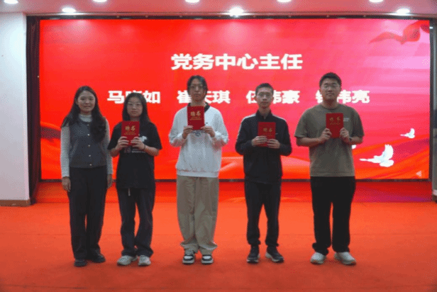 随后,大会进入学院新一届学生骨干聘任仪式环节。黎耀元老师宣读2025-2026学年党务中心、团委、学生会、青协及辅导员助理的聘任名单。新任骨干们依次有序上台,从老师手中接过聘书。这份聘书,不仅是一份认可,更是沉甸甸的责任与嘱托。