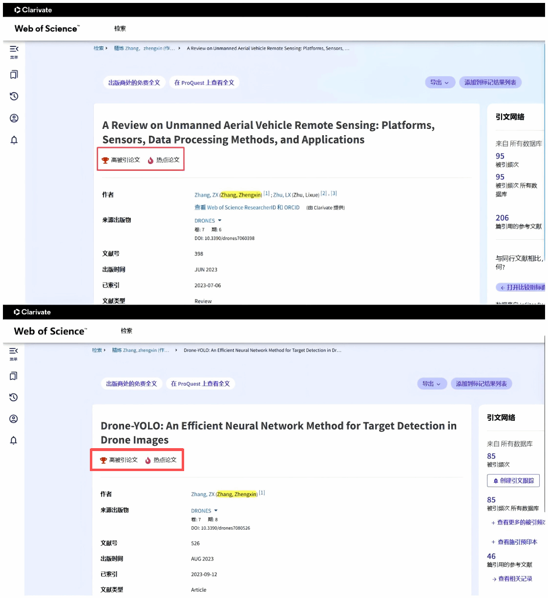 近日,国际权威学术评价机构科睿唯安 (Clarivate) 发布的最新 ESI (Essential Science Indicators) 数据显示,我院张正欣老师在 DRONES (JCR分区 Q1)发表的题为“A Review on Unmanned Aerial Vehicle Remote Sensing: Platforms, Sensors, Data Processing Methods, and Applications”以及“Drone-YOLO: An Efficient Neural Network Method for Target Detection in Drone Images”两篇研究论文成功入选ESI 1月和5月公布的Geosciences学科全球前0.1%热点论文。