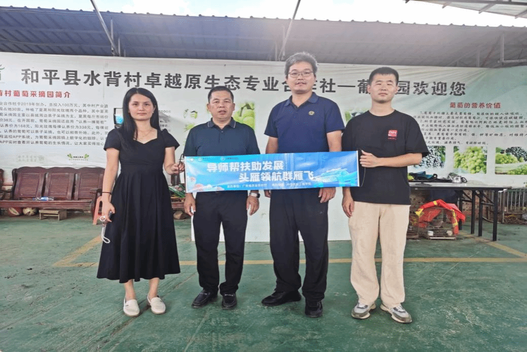 近日,仲恺农业工程学院头雁导师刘同来、杨汉章一行赴河源市和平县大坝镇水背村,对头雁学员、卓越原生态专业合作社负责人卢婷开展回访指导,重点围绕葡萄种植技术优化、线上线下销售拓展、品牌建设及项目申报的信息化应用等方面,为合作社提供精准化、数字化支持。